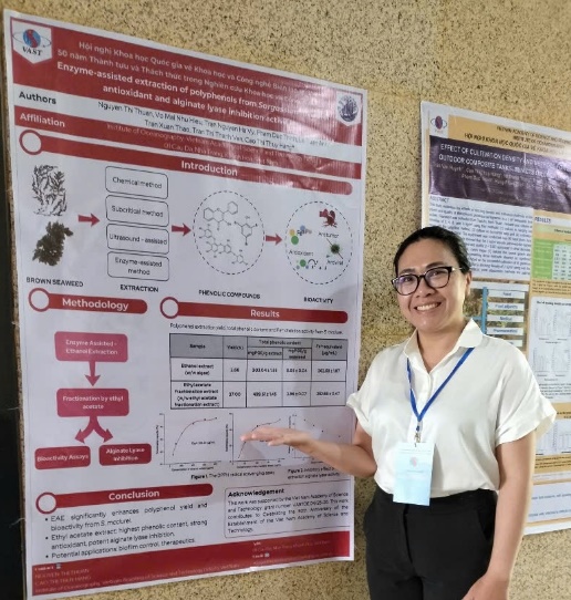Nghiên cứu do TS. Nguyễn Thị Thuận và cộng sự thực hiện được công bố trên Journal of Applied Phycology (2025). Công trình đã so sánh hai phương pháp chiết tách fucoidan – bằng enzyme và bằng hóa chất – từ rong nâu Saccharina latissima, một loài rong sinh trưởng ở vùng ôn đới, qua đó làm rõ ảnh hưởng của từng phương pháp đến cấu trúc phân tử và hoạt tính sinh học của hợp chất này. Bốn phân đoạn fucoidan (SlF2, SlF3, SlChF2, SlChF3) có khối lượng 50–800 kDa đã được thu nhận, trong đó fucoidan chiết bằng enzyme bảo toàn cấu trúc nhóm sulfate và thể hiện hiệu quả ức chế tế bào ung thư ruột (72%) và ung thư da (90%), đồng thời không gây độc đối với tế bào bình thường. Công bố này lần đầu tiên xây dựng mô hình tương quan cấu trúc – hoạt tính cho fucoidan, mở ra tiềm năng ứng dụng công nghệ enzyme trong các quy trình tách chiết, thu nhận fucoidan phục vụ sản xuất dược phẩm, thực phẩm chức năng và mỹ phẩm sinh học biển tại Việt Nam.