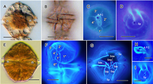 Hình 6 (A–I): Alexandrium ((A,B,E): D.I.C.; (C,D,F,G–I): epifluorescent). Alexandrium affine (A–D) và Alexandrium fraterculus (E–I). Các thanh tỉ lệ = 10 µm.