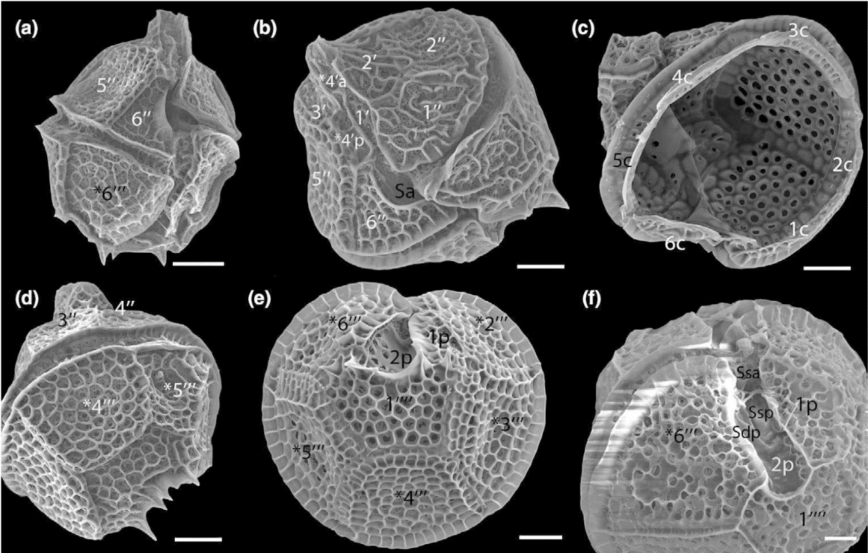 Một nghiên cứu khác của Phòng cũng ghi nhận loài mới cho khoa học Gonyaulax carbonell-mooreae (Hình 7), được phát hiện từ các bào tử có hình thái tương đồng với Spiniferites bentorii, được xem là tương đương với Spiniferites bullatus có niên đại từ kỷ Campanian. Bên cạnh đó, Gonyaulax kunsanensis được xác định có phân bố rộng trên các vùng biển thuộc Đại Tây Dương, Ấn Độ Dương và Thái Bình Dương, trong khi G. lewisiae lại có phạm vi phân bố hẹp hơn. Trong nghiên cứu này, độc tính của G. kunsanensis cũng được kiểm nghiệm bằng phương pháp sắc ký lỏng kết hợp khối phổ hai lần (LC–MS/MS), và không phát hiện hàm lượng đáng kể của độc tố yessotoxin (Huang và cộng sự, 2025).