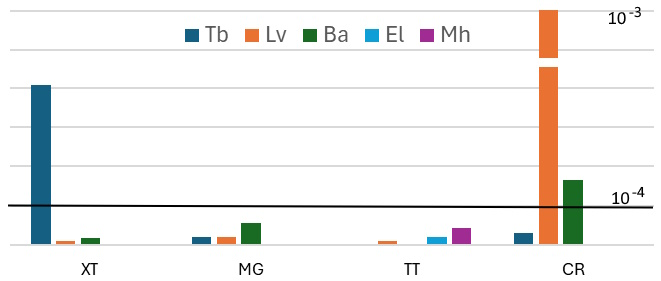 Hình 8: Ước tính chỉ số nguy cơ ung thư (ILCRs) từ một số loài hải sản nuôi trồng tại Khánh Hòa. Đường thẳng đậm: Ngưỡng mức độ cho phép. XT = Xuân Tự, MG = Mỹ Giang, TT = Thủy Triều, CR = Cam Ranh. Tb= Trachinotus blochii, Lv = Litopenaeus vannamei, Ba = Babylonia areolata, El = Epinephelus lanceolatus, Mh = Marcia hiantina.
