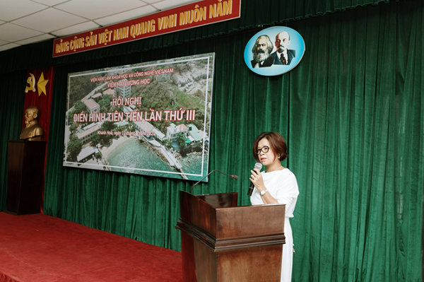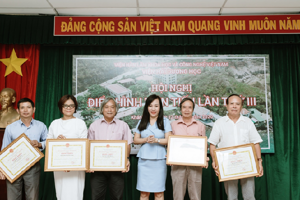 Hội nghị đã lắng nghe báo cáo tham luận của 02 tập thể và 02 cá nhân điển hình tiên tiến giai đoạn 2015 – 2020 và bình chọn Tập thể Viện Hải dương học và 02 đại biểu tham dự Đại hội thi đua yêu nước cấp trên. Thay mặt Ban Thi đua Khen thưởng tỉnh, Bà Ngô Thị Hồng Gấm đã trao bằng khen của Chủ tịch UBND tỉnh Khánh Hòa cho tập thể Viện Hải dương học và 04 cá nhân có thành tích tiêu biểu giai đoạn 2015 – 2020.