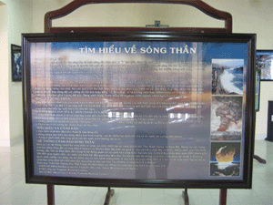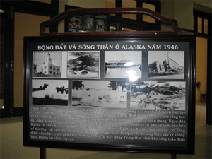Chúng ta biết rằng các tai biến thiên nhiên là những hiện tượng tự nhiên gây ra những thiệt hại to lớn về người và của cải. Chỉ trong giai đoạn 1993 – 2002, đã có 6.000 vụ thiên tai làm chết hơn 620.000 người. Các loại tai biến nhiên tại các vùng ven biển như sóng thần, bão, lũ lụt, động đất đã được 40 áp phích, pa nô giới thiệu đến người xem toàn cảnh những thiệt hại mà các tai biến thiên nhiên đã gây ra cho các nước ven biển kể cả Việt Nam trong những năm gần đây. Bên cạnh những hình ảnh khủng khiếp về tác hại của các tai biến thiên nhiên, các thông tin hữu ích như: tìm hiểu về sóng thần, nguy cơ về sóng thần ở Việt Nam, nguyên nhân và những biện pháp phòng ngừa thiên tai, những tín hiệu nhận biết các tai biến… được giới thiệu một cách súc tích và dễ hiểu. Ngoài ra phòng trưng bày còn có một màn hình hiển thị cơ sở dữ liệu về động đất trên qui mô toàn cầu. Đây là phương tiện không những làm thỏa mãn nhu cầu tìm hiểu của người xem mà còn hữu ích cho học sinh, sinh viên cũng như cán bộ nghiên cứu liên quan đến lĩnh vực này.