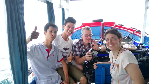 Các nhà khoa hôc của hai đơn vị đi thu mẫu rong biển tại vịnh Nha Trang, tháng 6/2019