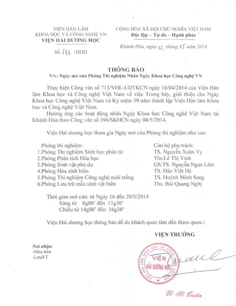 Thực hiện Công văn số 713/VHL-UDTKCN ngày 18/04/2014 của Viện Hàn lâm Khoa học và Công nghệ Việt Nam về việc Trưng bày, giới thiệu cho Ngày Khoa học Công nghệ Việt Nam và Kỷ niệm 39 năm thành lập Viện Hàn lâm Khoa học và Công nghệ Việt Nam.