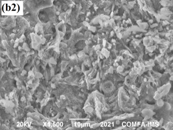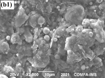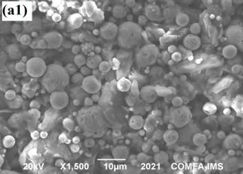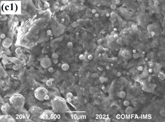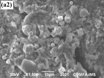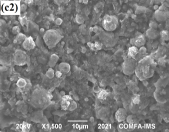 Ảnh SEM của lớp phủ silicate giàu kẽm với hàm lượng hợp kim ZnAl dạng vảy thay thế khác nhau: (a1 và a2) lớp phủ M1 (0% ZnAl), (b1 và b2) lớp phủ M2 (5 % ZnAl) không tiền xử lý, và (c1 và c2) lớp phủ M4 (5 % ZnAl) có tiền xử lý, với a1, b1 và c1 là là mẫu trước và a2, b2 và c2 là mấu sau thử nghiệm mù muối 1000 giờ.
