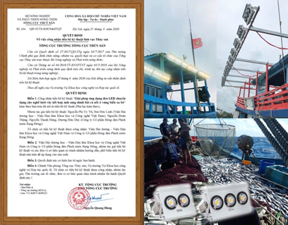 Ngày 21/8/2020, Tổng cục Thủy sản – Bộ Nông nghiệp & Phát triển nông thôn đã ban hành quyết định số 454/QĐ-TCTS-KHCN&HTQT công nhận tiến bộ kỹ thuật trong lĩnh vực thủy sản đối với “Giải pháp ứng dụng đèn LED chuyên dụng cho nghề lưới vây kết hợp ánh sáng đánh bắt cá nổi ở vùng biển xa bờ” cho Viện Hải dương học, Viện Hàn lâm Khoa học và Công nghệ Việt Nam và Công ty CP Bóng đèn Phích nước Rạng Đông.